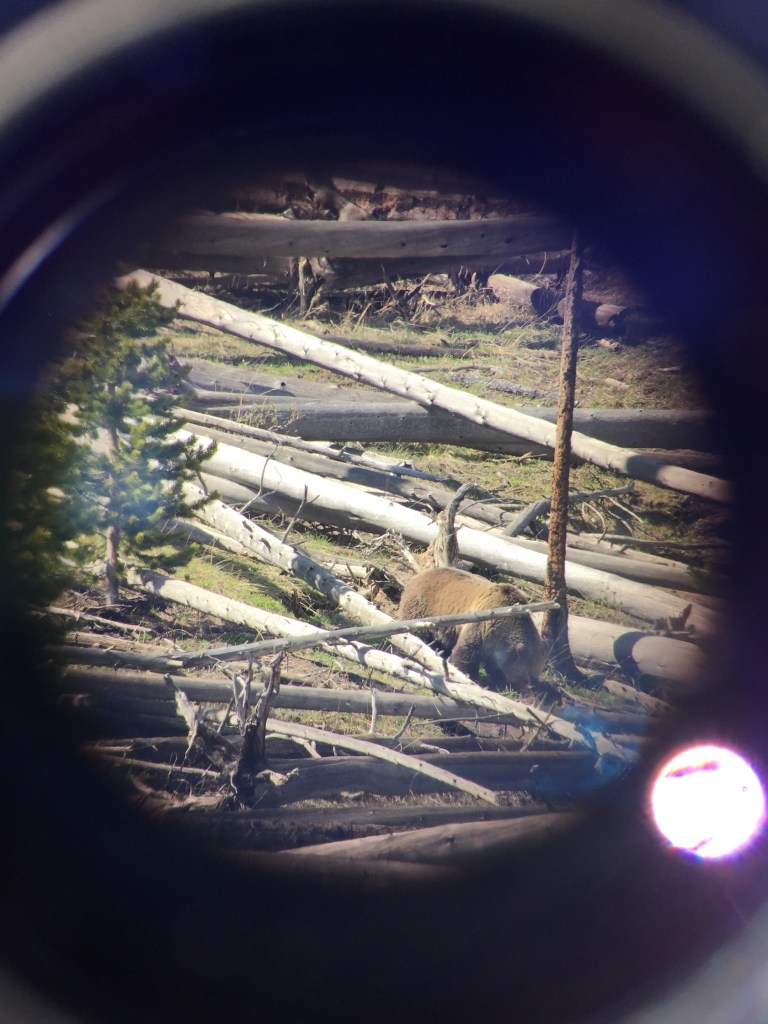 I went east from Yellowstone Lake and in an old burn the cars were lined up. I got my scope out and above us digging ground squirrels in the burn was a grizzly. It seemed to be a younger bear, a sandy blonde, moving among the fallen lodgepoles with the chilling grace and ease of its kind. It dug and rooted. The sun shone on my back, there was good glass under my eye and a bear to watch. My joy was full.